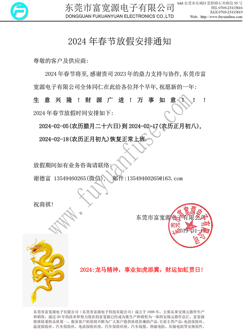 尊敬的客戶及供應(yīng)商: 2024年春節(jié)將至,感謝貴司2023年的鼎力支持與協(xié)作,東莞市富寬源電子有限公司全體同仁在此給各位拜個早年,祝愿新的一年: 生意興隆!財源廣進!萬事如意?。?/b>! 2024年春節(jié)放假時間安排如下: 2024-02-05(農(nóng)歷臘月二十六日)到2024-02-17(農(nóng)歷正月初八), 2024-02-18(農(nóng)歷正月初九)恢復(fù)正常上班.