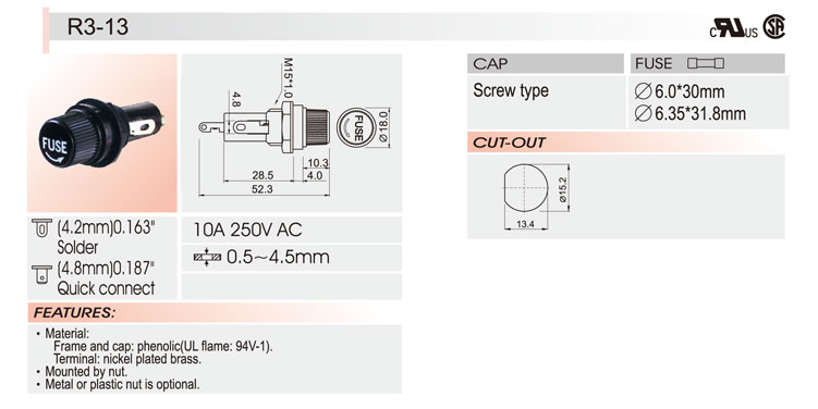 6*30面板安裝保險(xiǎn)絲座 R3-13 UL CSA 10A250V
