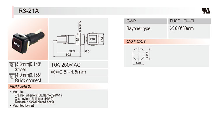 6*30 面板安裝保險(xiǎn)絲座 R3-21A UL CSA 10A250V