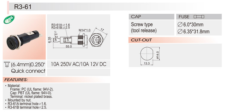 6*30 面板安裝保險絲座 R3-61 UL CSA ROHS