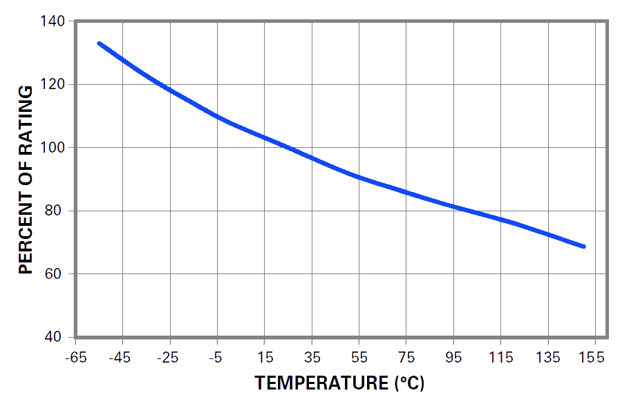 Notes: 1. AC Interrupting Rating tested at rated voltage with unity power factor. DC Interrupting Rating tested at rated voltage with time constant < 0.8 msec.2. Nominal Resistance measured with < 10% rated current. 3. Nominal Melting I2t measured at 1 msec. opening time. 4. Nominal Voltage Drop measured at rated current after temperature has stabilized. Devices designed to carry rated current for 4 hours minimum. It is recommended that devices be operated continuously at no more than 80% rated current. See “Temperature Derating Curve”for additional derating information.Devices designed to be mounted with marking code facing up. Temperature Derating Curve