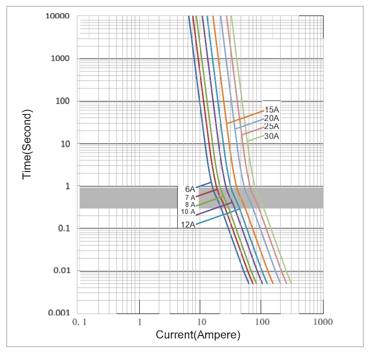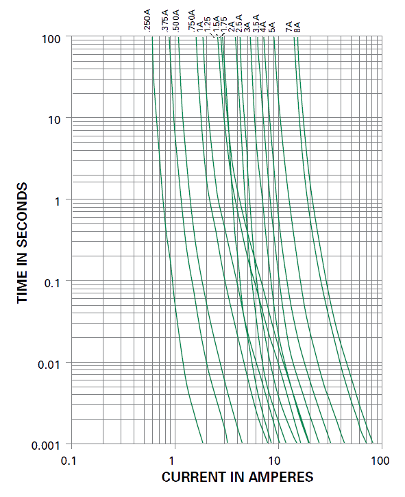 Notes: 1. Derating depicted in this curve is in addition to the standard derating of 20% for continuous operation. Example: For continuous operation at 75 degrees celsius, the fuse should be derated as follows:I = (0.80)(0.85)IRAT= (0.68)IRAT Average Time Current Curves