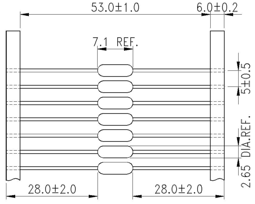 4.外觀及形狀 APPEARANCES AND CONFIGURATION 4-1外觀:外觀不應有顯著的污點、鐵銹或者裂紋 Appearances:There shall not be any remaekable stain,rust or crack on the appearances. 4-2形狀:軸向引腳的超小型保險絲 Configuration:Axial Leaded Micro-Fuse. 5.物理特性 PHYSICAL CHARACTERISTIC 5-1 拉力測試 Tensile test 沿端子的軸向施加10N的拉力,持續(xù)1分鐘。 Keep pulling the cap of the fuse with 10N at axial direction for 1 min. 6.電氣特性 ELECTRICAL CHARACTERISTICS