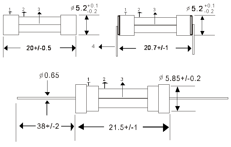 例子[example]: 5CH 1A 1000V 1)系列號 Part Number 2)額定電流 Rated Current 1) 2) 3) 3)額定電壓 Rated Voltage 1-2 額定電流和額定電壓 Rated Current And Voltage 額定電流: 63mA~15A Rated Current: 63mA~15A 額定電壓:500V/600V/1000V AC/DC Rated Voltage: 500V/600V/1000V AC/DC 1-3標(biāo)示Marking 保險絲上需有下列標(biāo)示 The fuse shall have the following marking: 規(guī)格:特性符號+額定電流+額定電壓 Specification:Characteristic Symbol+Rated Voltage 63mA~800mA : _mA500V/600V/1KV 1A~15A:_A500V/600V/1KV Trade mark:The Manufacture’s Logo+Part Number+Approvals 63mA~15A: 注意:對標(biāo)示字樣大小沒有規(guī)定 Note:Size of the markings have not be specified. 2.適用範(fàn)圍 SCOPE 適用於一般電子設(shè)備。Used in electronic equipment. 3.工程圖和結(jié)構(gòu) OUTLINE DRAWING AND STRUCTURE 3-1 工程圖(單位:mm) Outline Drawing and Dimensions(Unit:mm)