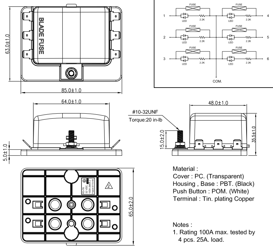 1.適合船舶、房車或外部裝修類型應(yīng)用的保險(xiǎn)絲盒,透明防護(hù)罩防水防塵、污垢進(jìn)入 2.保險(xiǎn)絲損壞時(shí),紅色 LED 指示, 按下閂鎖即可輕鬆打開